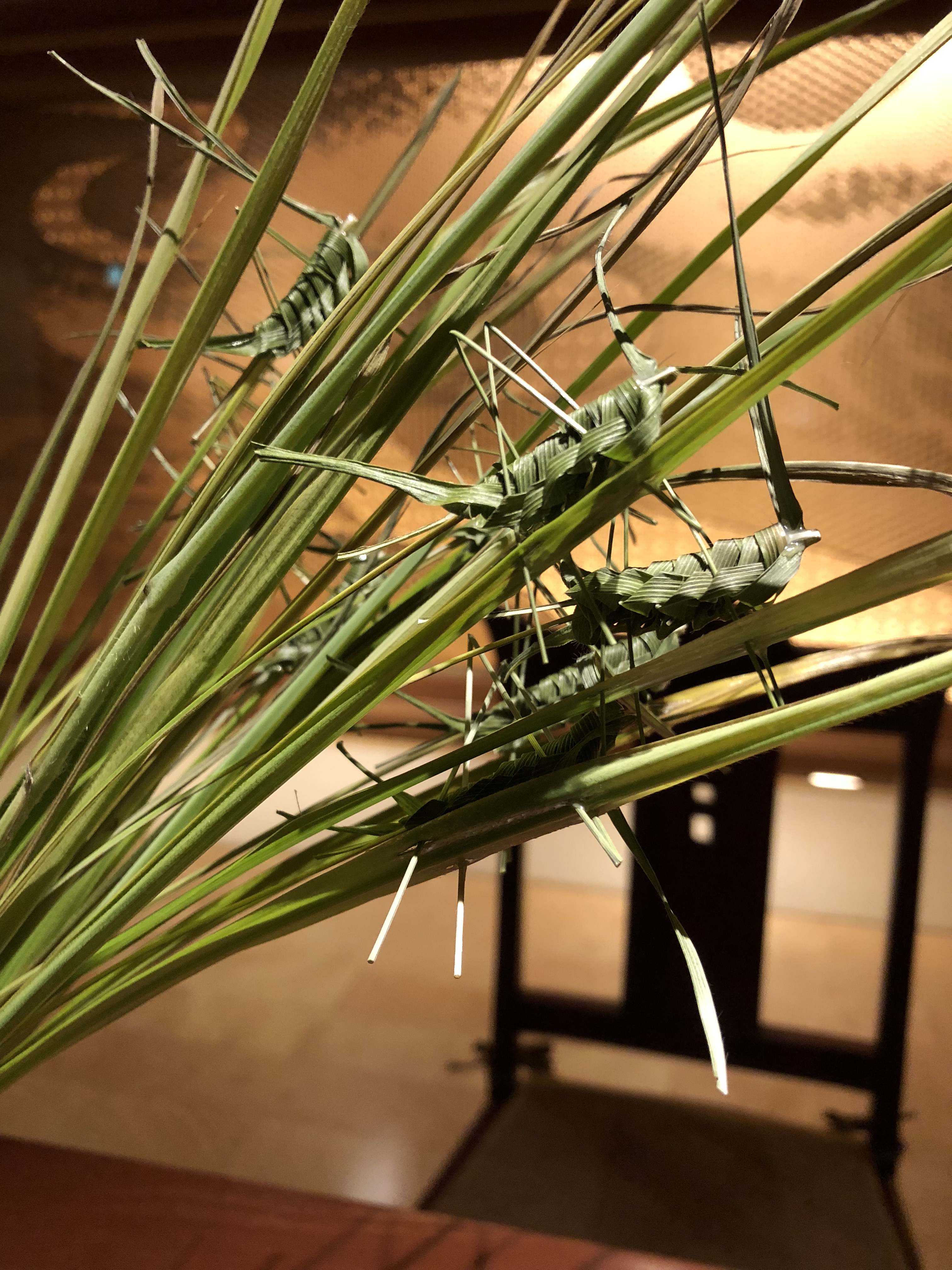 当館ラウンジに新たに飾り付けたものを紹介します。 何気に通り過ぎようとしても、一瞬立ち止まって見入ってしまいます。 クレイフラワーデザイナーの北澤紀子様の作品。 本物のバッタを思わせる出来栄えに、ただ見惚れるばかりです。。。 ※北澤紀子様のホームページ => こちら